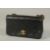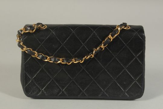 A CHANEL BLACK PADDED LEATHER SHOULDER BAG with long gilt metal and leather entwined strap.