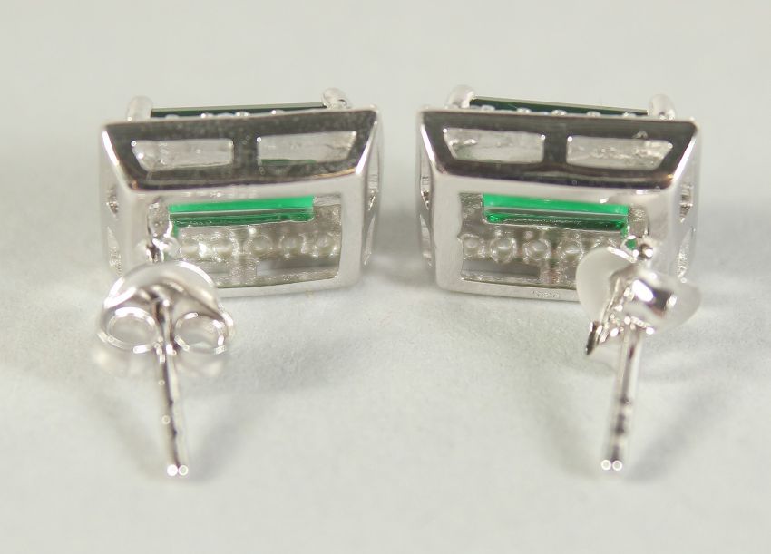 A PAIR OF SILVER AND FAUX EMERALD SQUARE SET EARRINGS