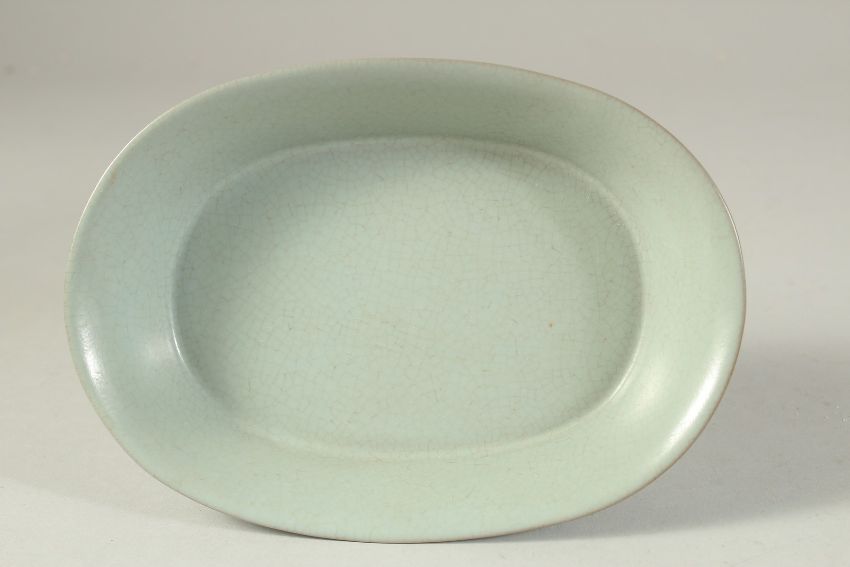 A CHINESE CELADON GLAZE OVAL FROM BRUSH WASHER raised on four feet.