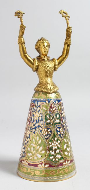 A GOOD VIENNA GILDED METAL AND GLASS WAGER CUP as a young lady with outstretched arms, the glass with various coloured enamels.