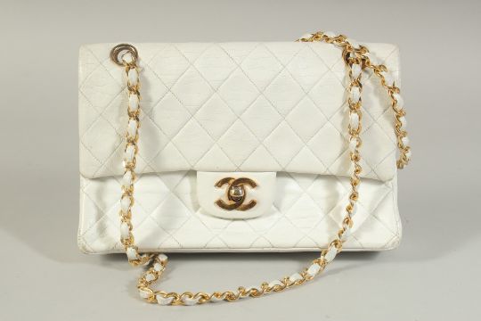 A CHANEL WHITE PADDED LEATHER EVENING BAG, 8.5ins long, with a gilt and white leather entwined strap and Chanel dust bag.
