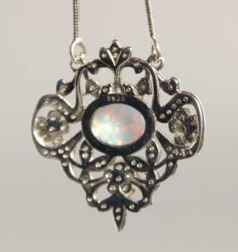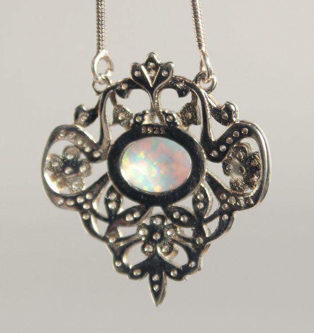 A SILVER AND OPAL PENDANT AND CHAIN.