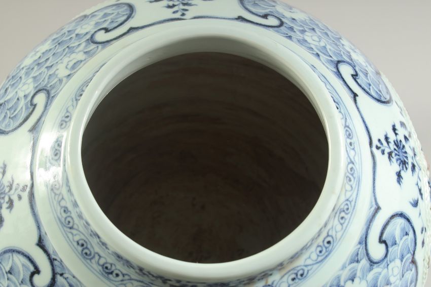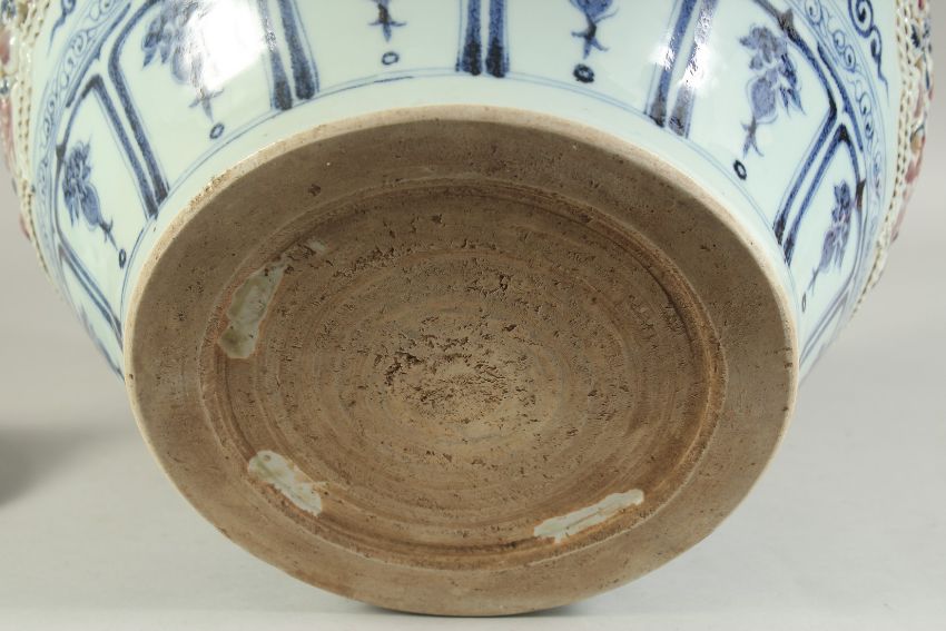 A LARGE CHINESE BLUE, WHITE AND UNDERGLAZE RED PORCELAIN JAR AND COVER, with relief panels depicting a child, amongst flora, the cover with foo do finial.