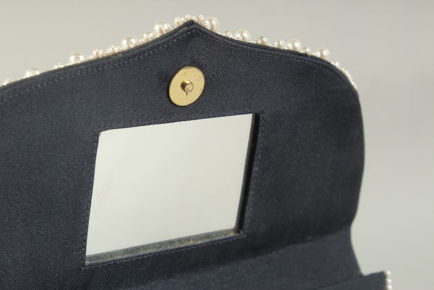 A BLUE VELVET AND PEARL EVENING BAG the inside with a small mirror.