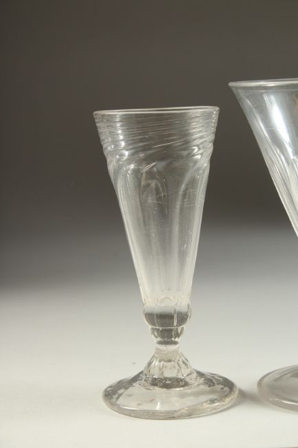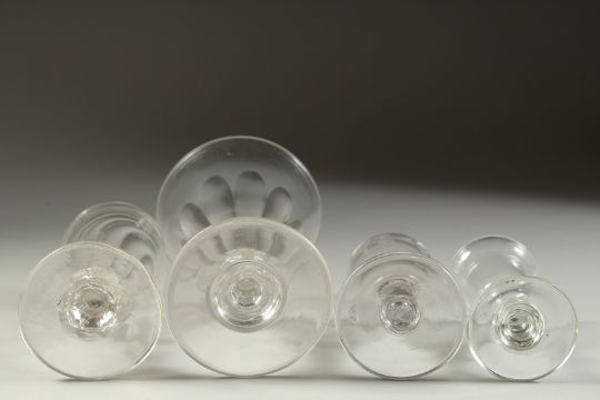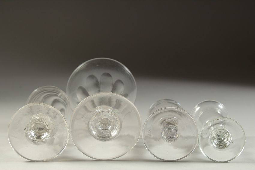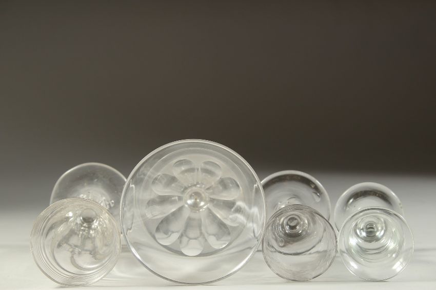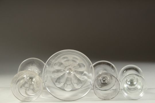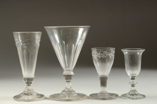 FOUR VARIOUS 18TH CENTURY ENGLISH WINE GLASSES, various heights.