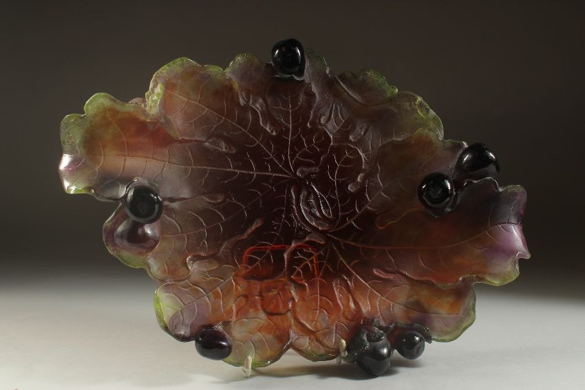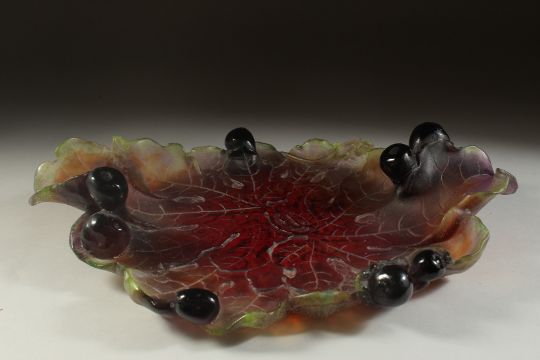 A SUPERB DAUM GREEN AND ORANGE LEAF DISH etched with leaves and figs in relief.