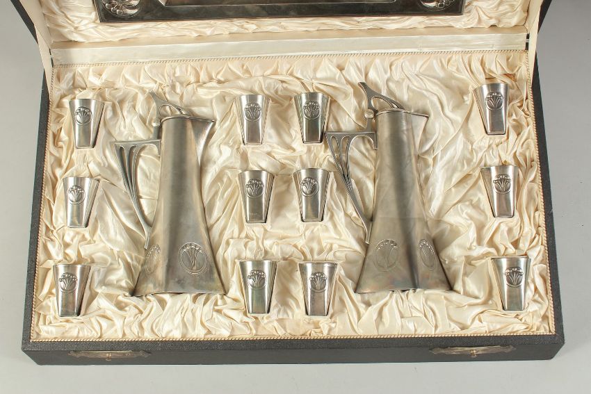 A GOOD W M F METAL ART DECO LIQUEUR SET comprising: two handled tray, 18.5ins long, 9 ins wide, a pair of jugs and covers and twelve drink tots, complete in a fitted leather case.