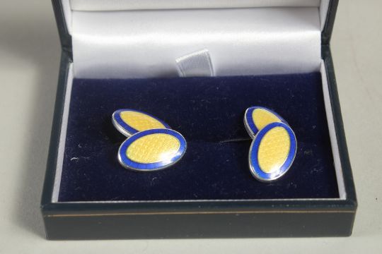 A PAIR OF STERLING SILVER AND ENAMEL OVAL SHAPED CUFFLINKS.