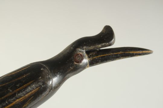 A WOODEN WALKING STICK with carved bird handle.