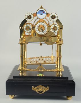 A GOOD ROLLING BALL MOON CONCAVE CLOCK with six dials, brass mounts, glass cover, on a stand with single drawer.
