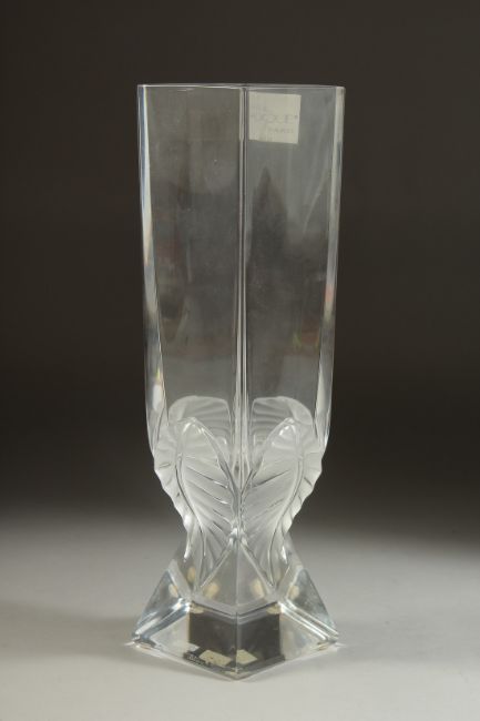A GOOD LALIQUE TALL SQUARE VASE with moulded leaves and square base.