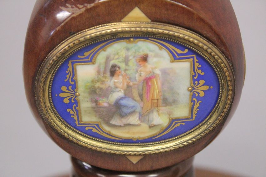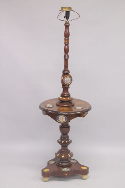 A RARE 19TH CENTURY MAHOGANY LAMP STAND TABLE inset with twelve oval SEVRES porcelain panels with classical figure subjects, six inlaid oval wooden portraits, bone segments on a triangular base.
