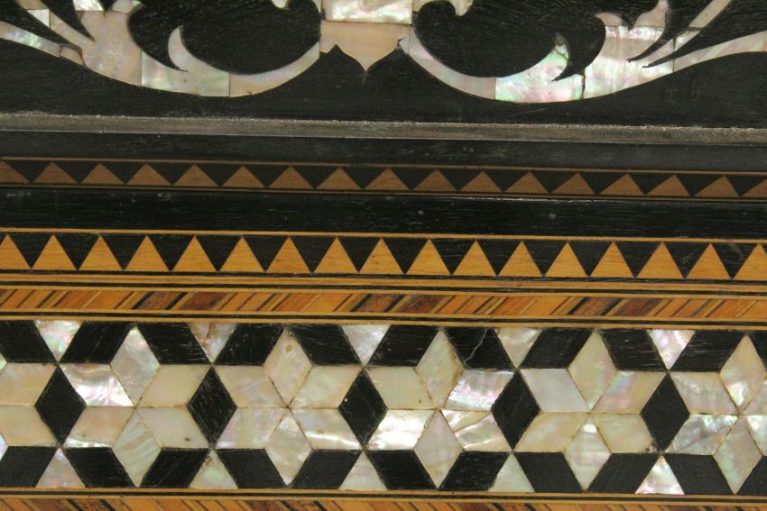 A FINE AND LARGE ISLAMIC TURKISH SHELL INLAID MIXED WOOD MIRROR, with decorative parquetry frame and inlaid foliate cresting with central Islamic emblem.