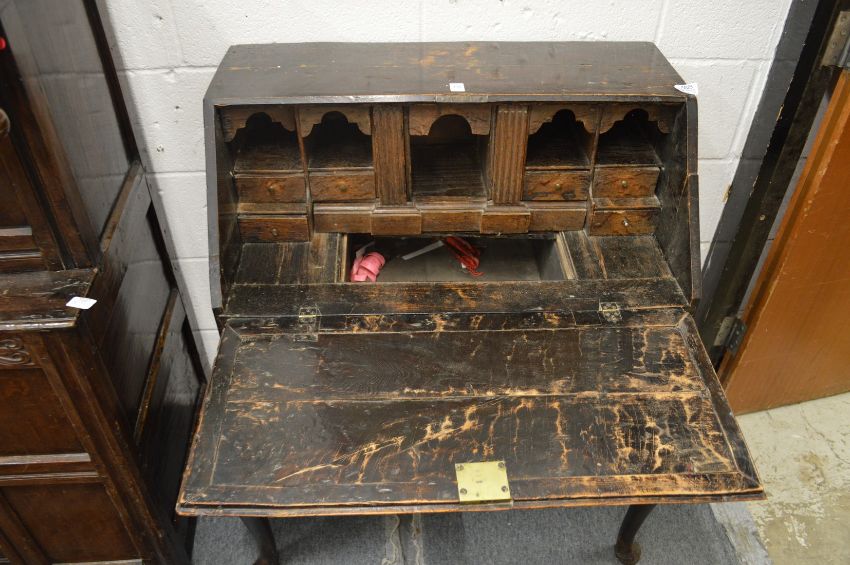 AN 18TH CENTURY CARVED OAK BUREAU on stand.