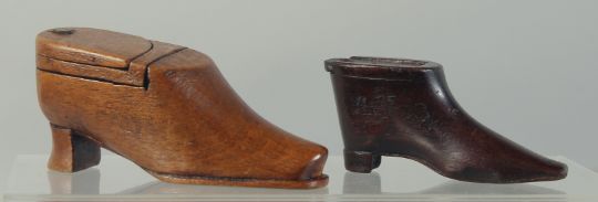 TWO TREEN SHOE SNUFF BOXES.