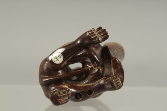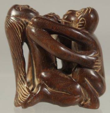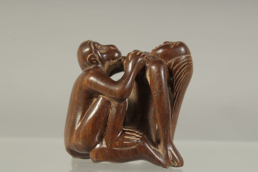 A CHINESE CARVED WOOD EROTIC NETSUKE.