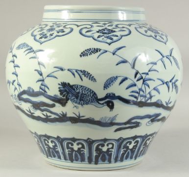 A LARGE CHINESE BLUE AND WHITE PORCELAIN JAR decorated with birds and flora.