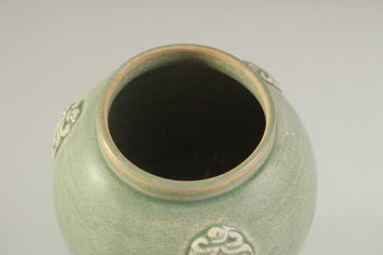 A CHINESE GREEN GLAZE POTTERY VASE with three moulded bosses.