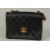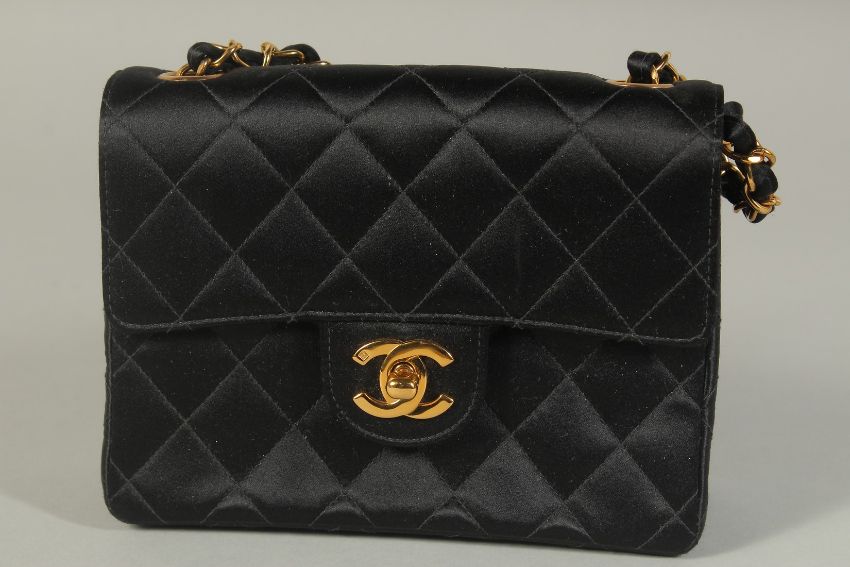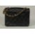 A CHANEL PADDED BLACK EVENING BAG with gilt interior, 6.5ins long, with a gilt metal and black leather entwined strap, 20ins long.