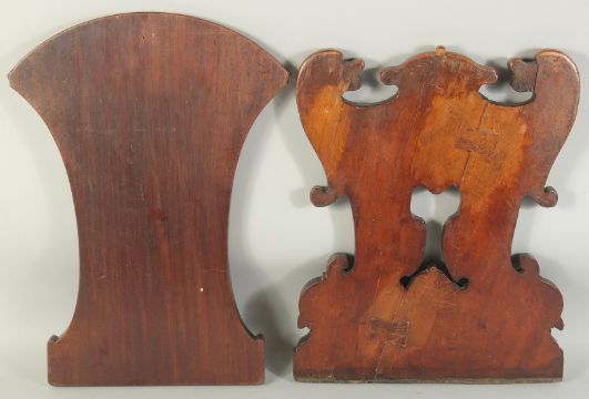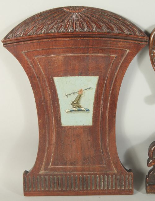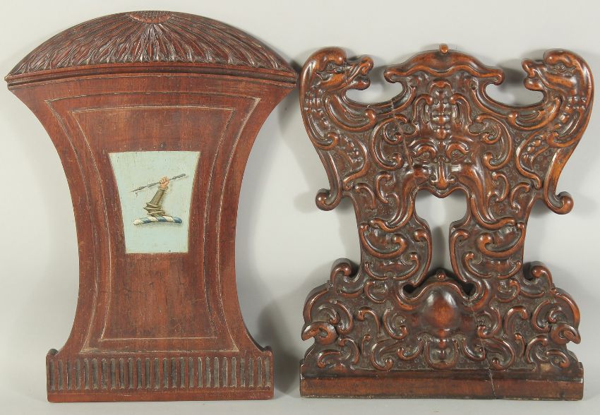 TWO CARVED WOOD CHAIR PANELS ARMORIAL AND GREEN MAN.