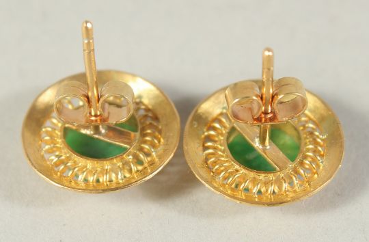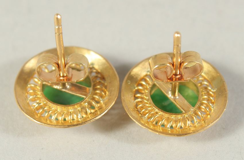 A PAIR OF 22CT GOLD JADE EARRINGS AND PENDANT.