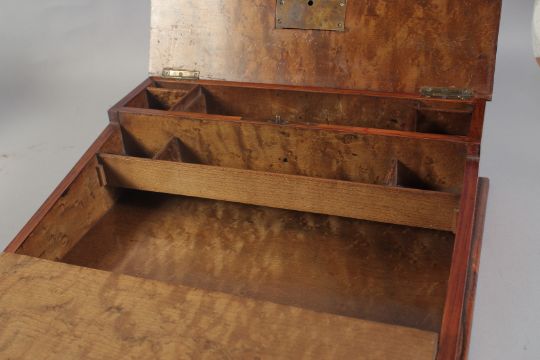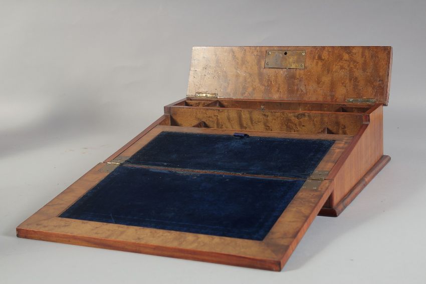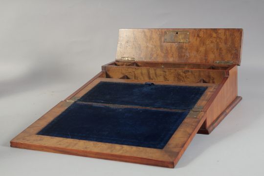 A GOOD 19TH CENTURY FRENCH KINGWOOD AND TULIP WOOD WRITING SLOPE with fold-over front in blue velvet writing surface.