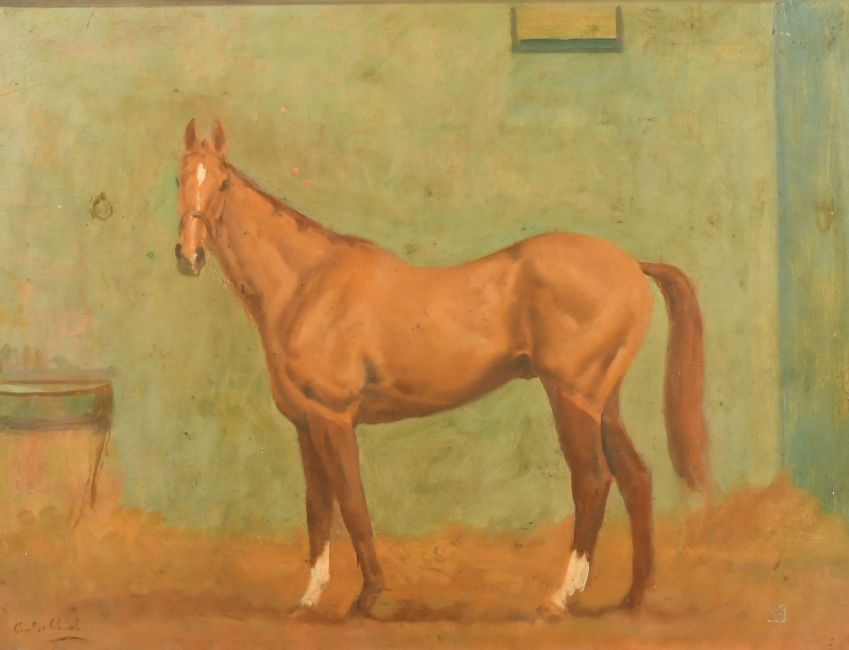 Charles Church (b. 1971) British, A bay horse in a stable, oil on board, signed, 19" x 24.5", (48 x 62cm).