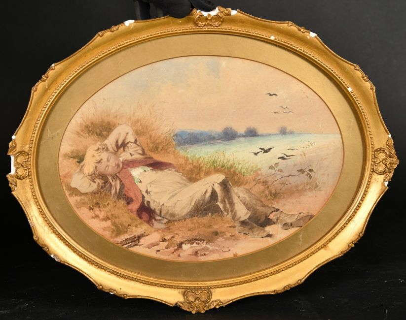 Late 19th Century, A young boy lying down on grass asleep near open water, watercolour, initialled, 9.5" x 13, (20x33cm) oval.
