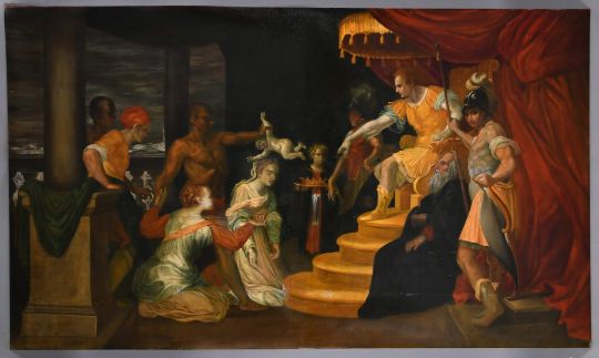 20th Century Continental School, The Judgement of King Solomon, oil on canvas, indistinctly signed, 51" x 86" (130 x 218cm), unframed, a/f.