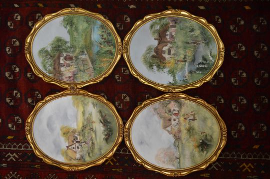 Pat Langton, a set of four gilt framed oval oil paintings on board depicting rural scenes.