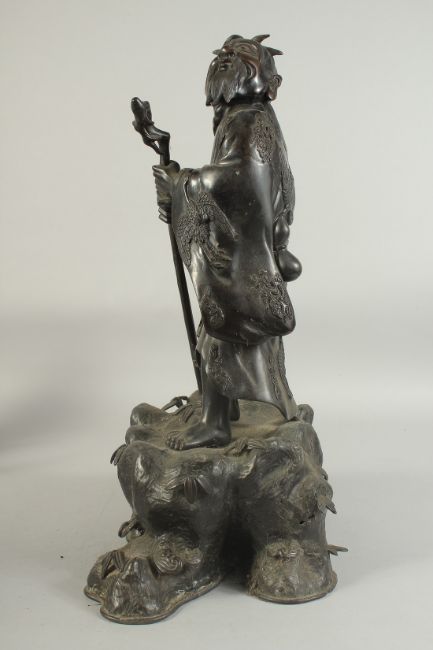 A LARGE 19TH CENTURY CHINESE BRONZE FIGURE OF LI TIEGUAI, elevated upon a large rock-formed bronze base, 48cm high.