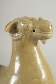 A LARGE GLAZED POTTERY FIGURE OF A STYLISED RAM, 27cm long.