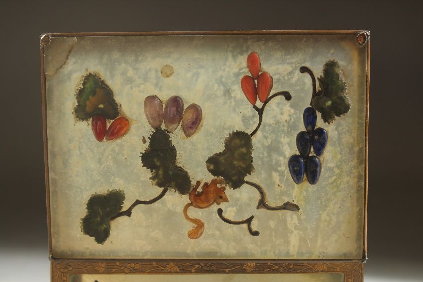 A 19TH CENTURY CHINESE JADE PANELLED RECTANGULAR BOX, overlaid with various stones depicting hanging fruits, the box constructed from engraved gilt metal mounts with hinged lid, 13cm x 9cm.