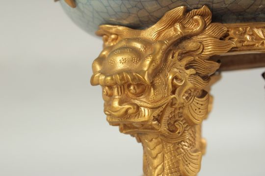 A CHINESE POWDER BLUE CRACKLE GLAZE BRASS MOUNTED CENSER, with dragon form handles mounted to the metal rim, the censer raised on beast-formed tripod legs, 32cm high.