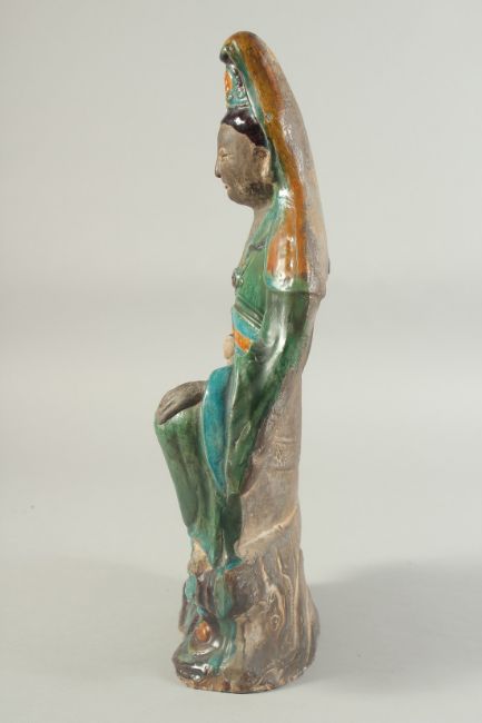 A LARGE CHINESE SANCAI SEATED GUANYIN AND CHILD, possibly Ming, glazed with green, turquoise, aubergine, and amber tones, 41cm high.