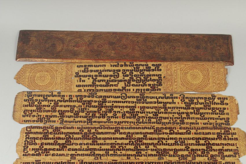 A VERY FINE AND LARGE 18TH-19TH CENTURY BURMESE OR SRI LANKAN LACQUERED PRAYER BOOK, 54cm x 9cm.