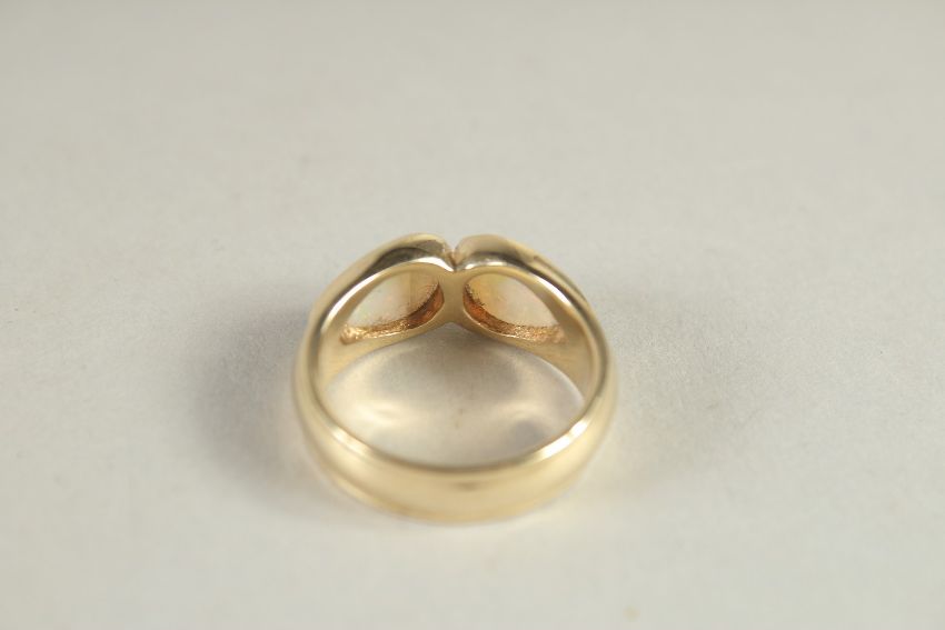 A 9 CARAT GOLD TWO STONE OPAL RING.