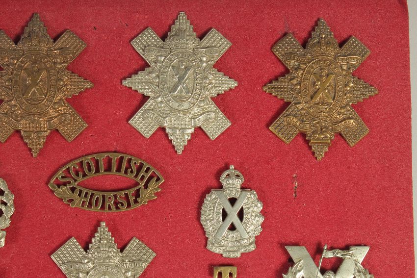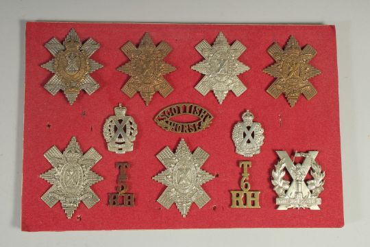 A COLLECTION OF 12 SCOTTISH REG. BADGES including: SCOTTISH HORSES, BLACK WATCH, T5RH, TYNESIDE.