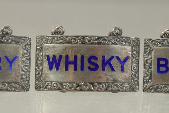 THREE SILVER AND ENAMEL WINE LABELS: SHERRY, BRANDY, WHISKY.