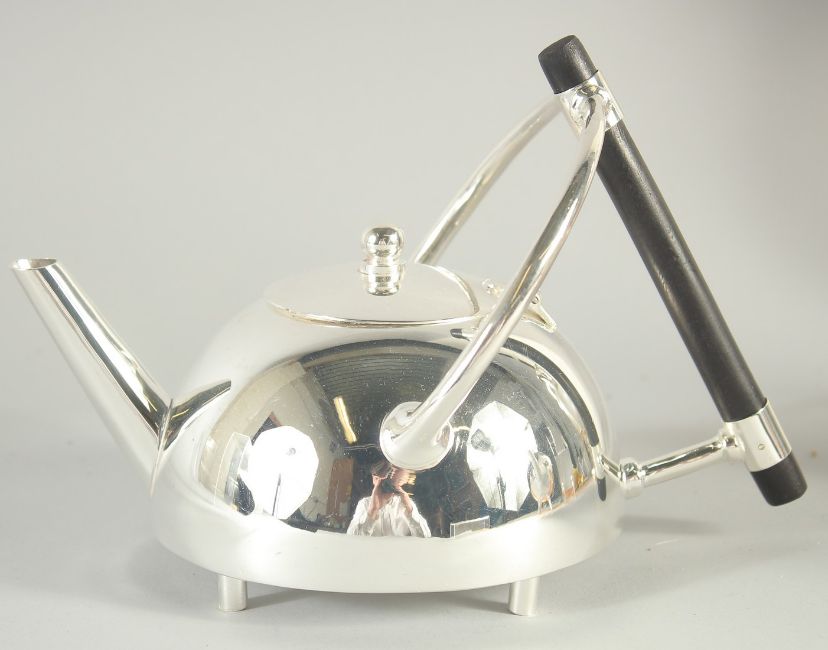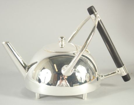 A CHRISTOPHER DRESSER DESIGN SILVER PLATED CIRCULAR SHAPE TEA POT.