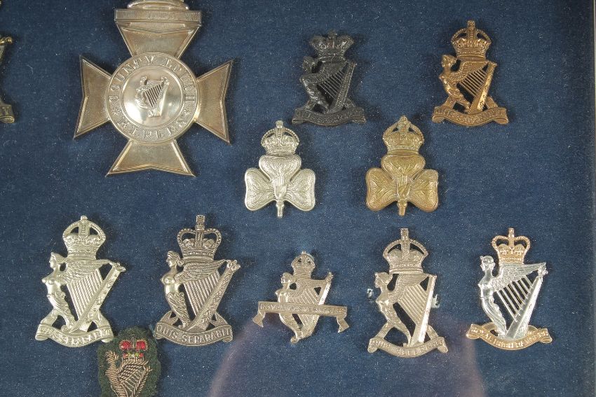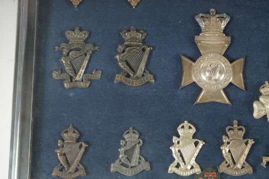 A FRAMED COLLECTION OF 19 SILVER AND BRONZE BADGES, COUNTY LOUTH RIFLES, ROYAL IRISH RIFLES, ROYAL ULSTER RIFLES. 83 (2), & 86.