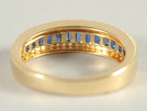 AN 18CT YELLOW GOLD, SAPPHIRE AND DIAMOND HALF LOOP RING.