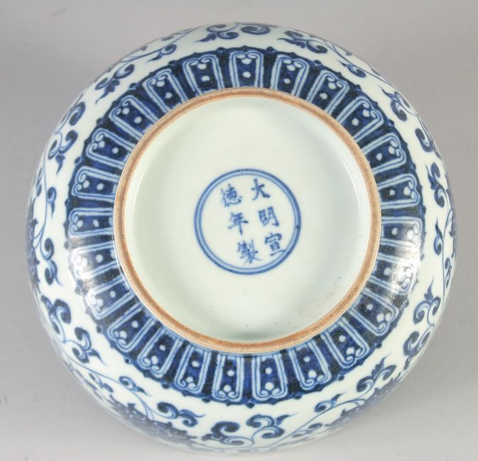 A CHINESE BLUE AND WHITE PORCELAIN BOWL, the exterior decorated with lotus and vine, six-character mark to base, 18cm diameter.