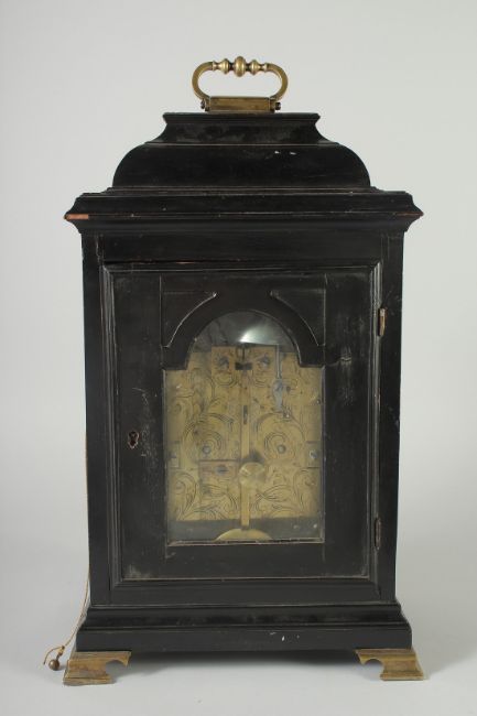 A SUPERB 18TH CENTURY BRACKET CLOCK by RICHARD PECKOVER, LONDON, NO. 513 with 6.5ins dial, silent and strike actions, striking on a single bell, engraved back plate. Fusee numerals, brass carrying handle and bracket feet.