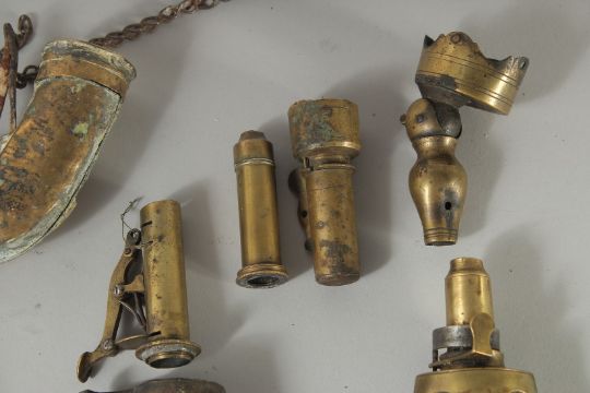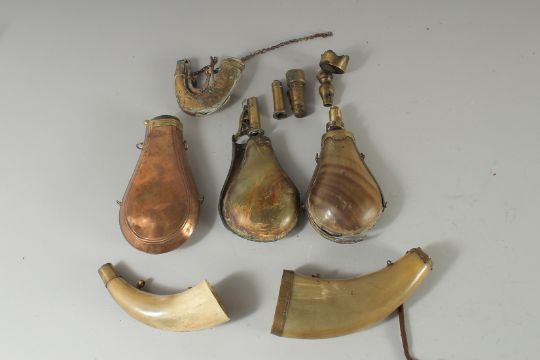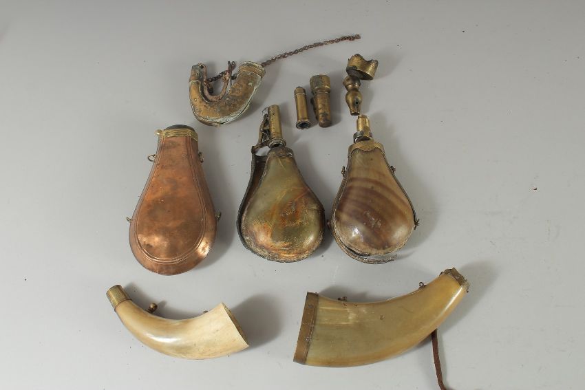 A BAG OF VARIOUS POWDER HORNS AND PIECES.