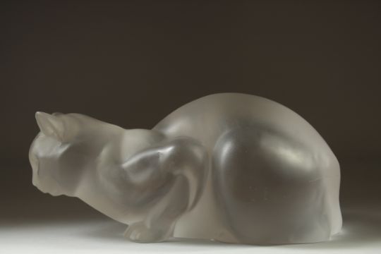 A LARGE LALIQUE FROSTED GLASS CROUCHING CAT.
