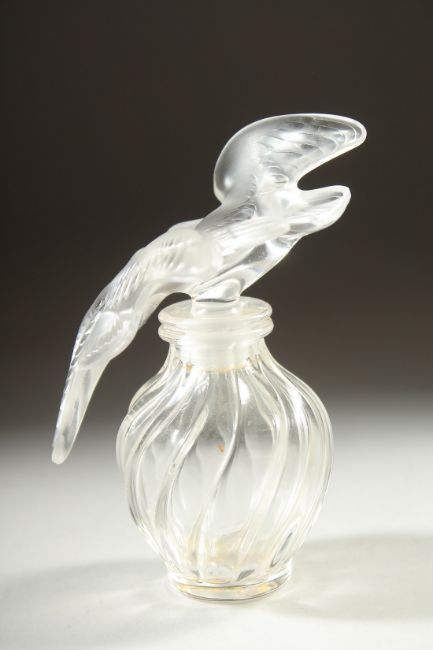 A LALIQUE GLASS SCENT BOTTLE the stopper as two birds.
