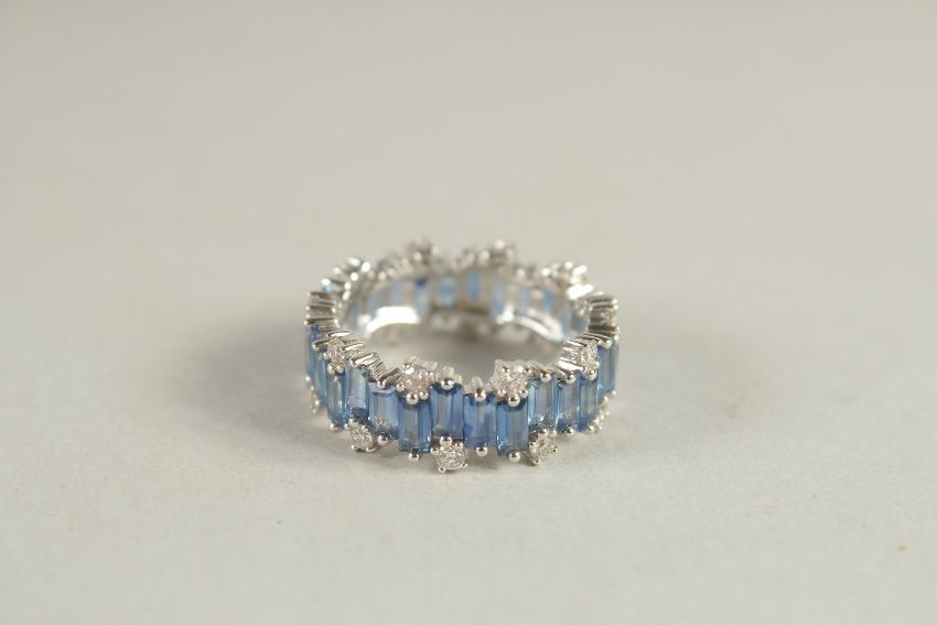 A GOOD 18CT WHITE GOLD CEYLON SAPPHIRE AND DIAMOND FULL RING.