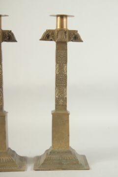 A PAIR OF, POSSIBLY AFRICAN, BRASS CANDLESTICKS.