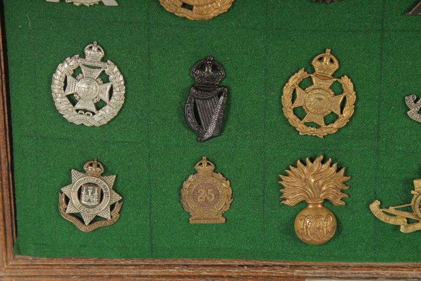 A FRAMED COLLECTION OF 30 BADGES "THE LONDON REGIMENT" from 1908 - 1937.
